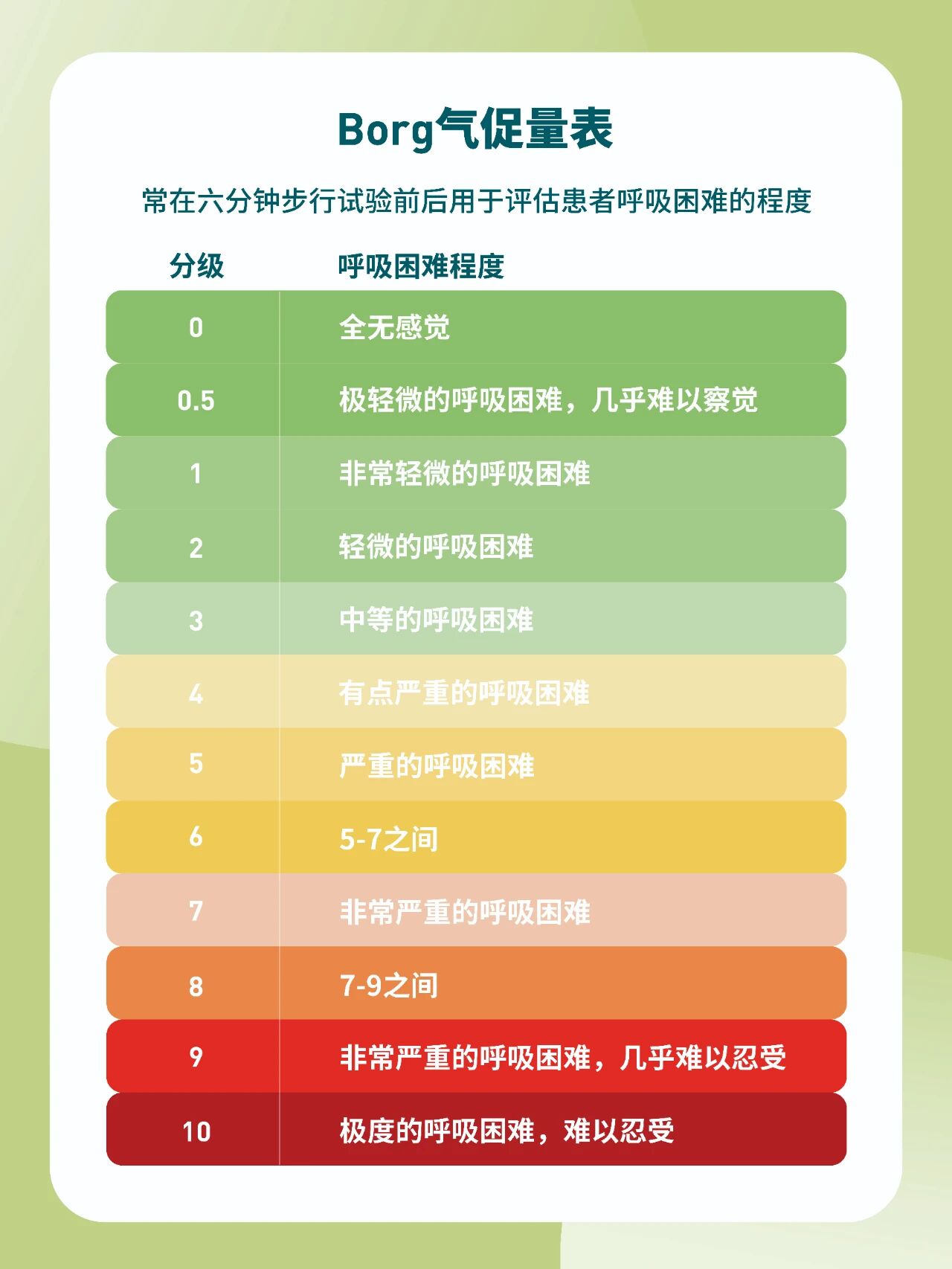 除了看血氧数值,运动时的主观感受也很重要。可以使用“Borg呼吸困难评分”(0~10级)进行呼吸困难的自我评估,保持在4~6级之间,即处于可以正常说话,但呼吸会稍显急促,无法唱歌的状态,避免过度劳累。